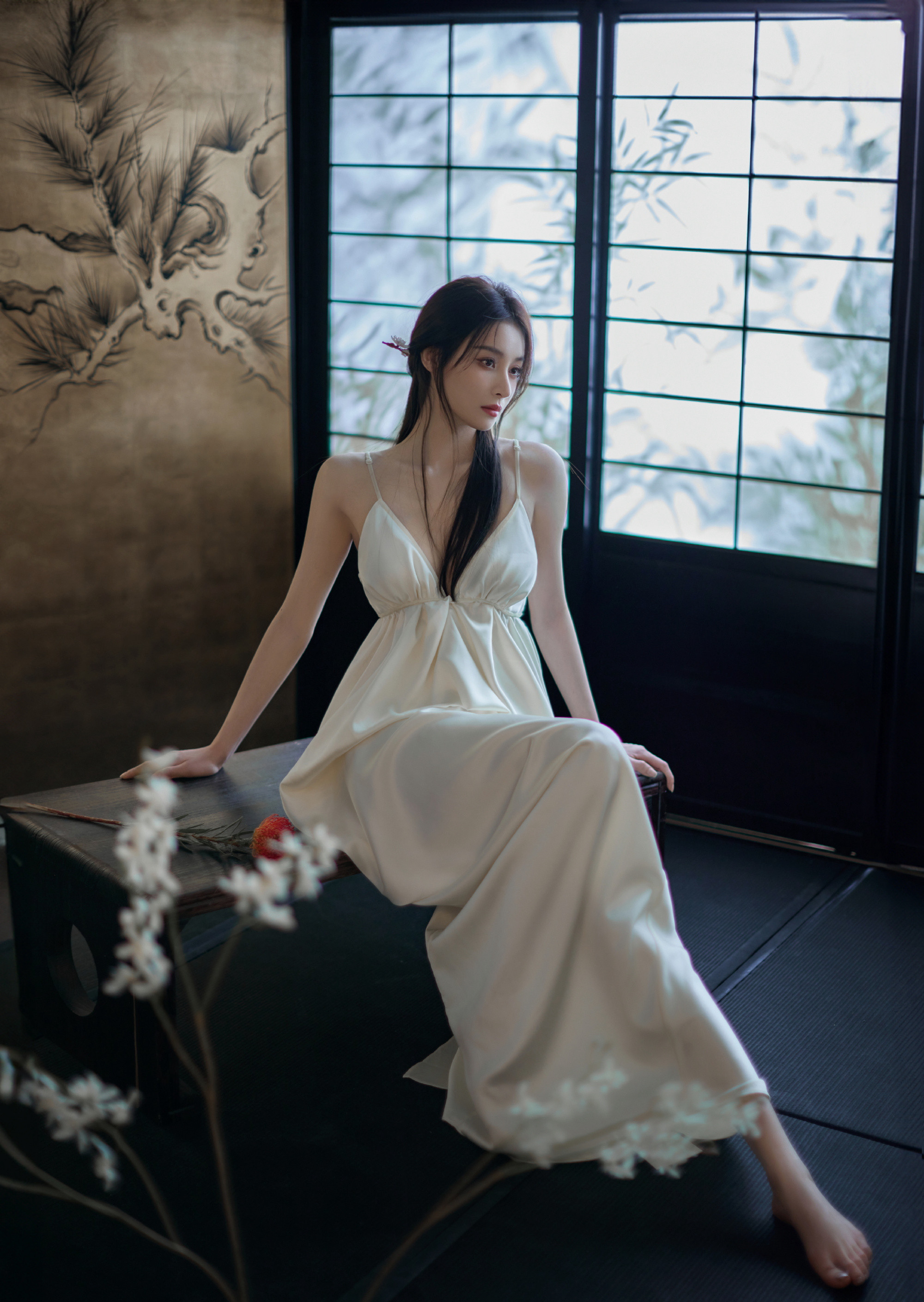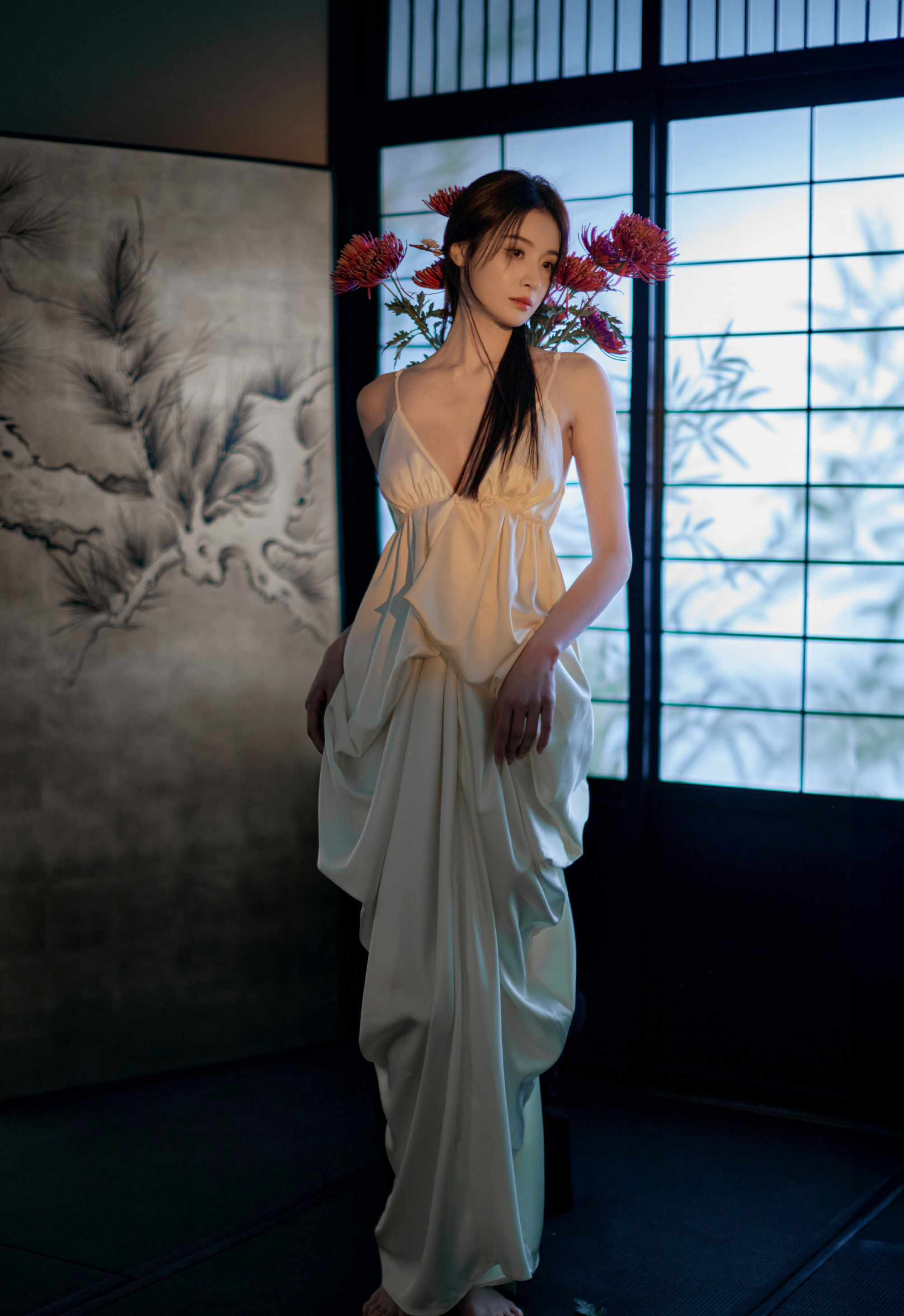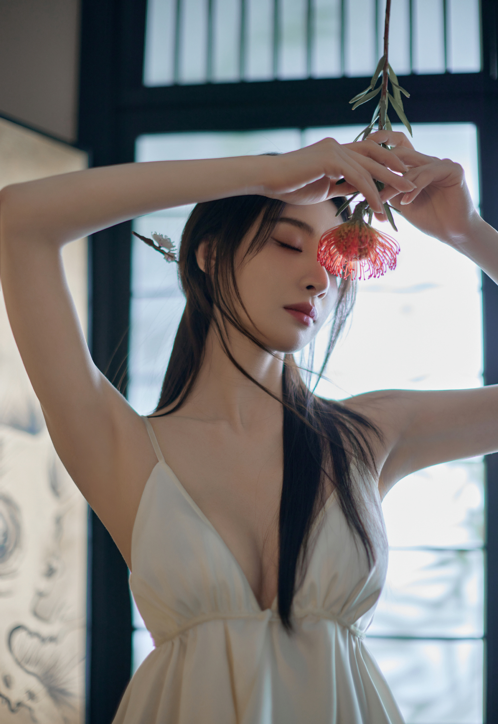 @ 美女演员隆妮性感吊带低胸白裙穿着与花争艳私房写真,这身材真的好好哦!