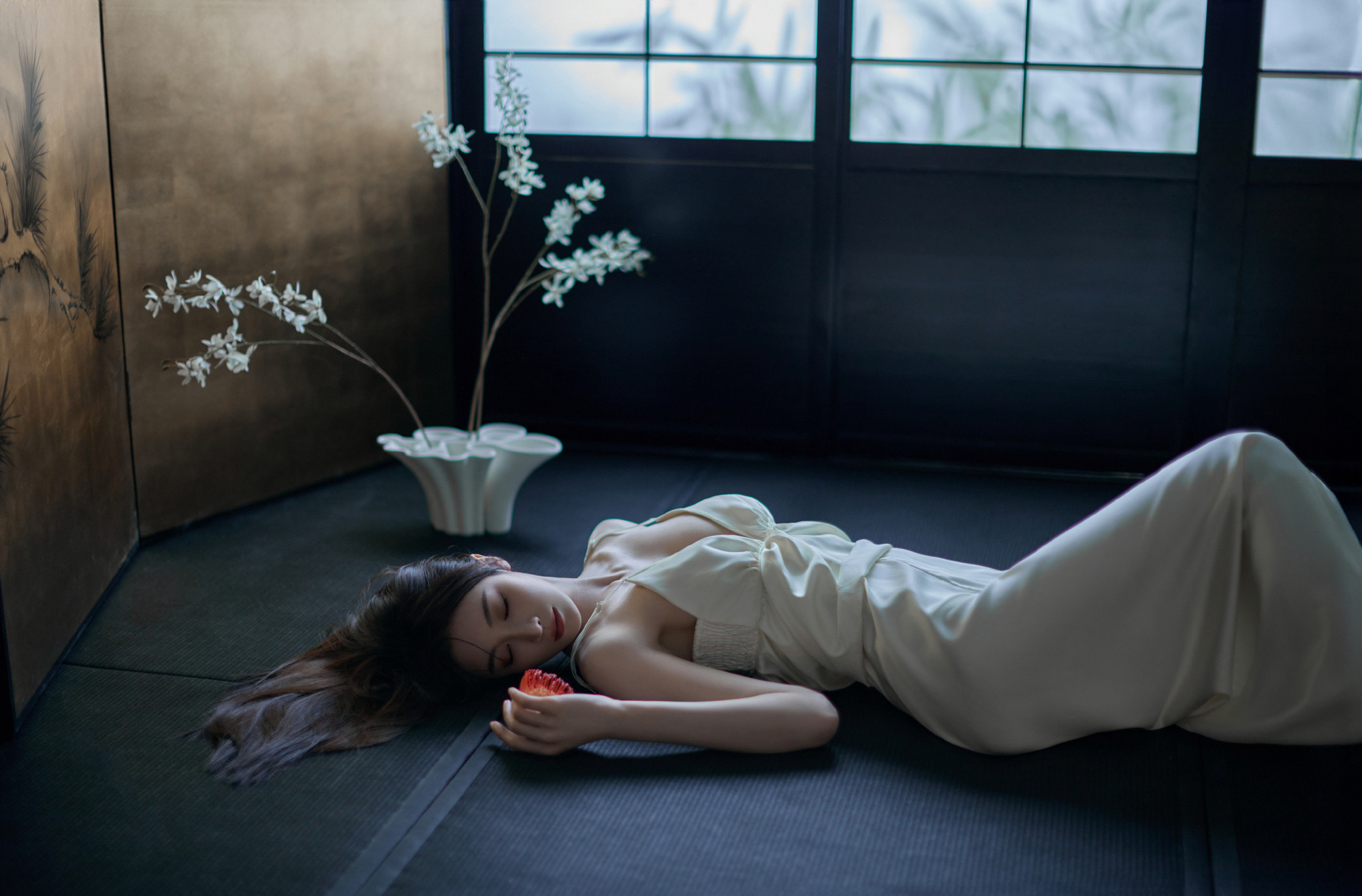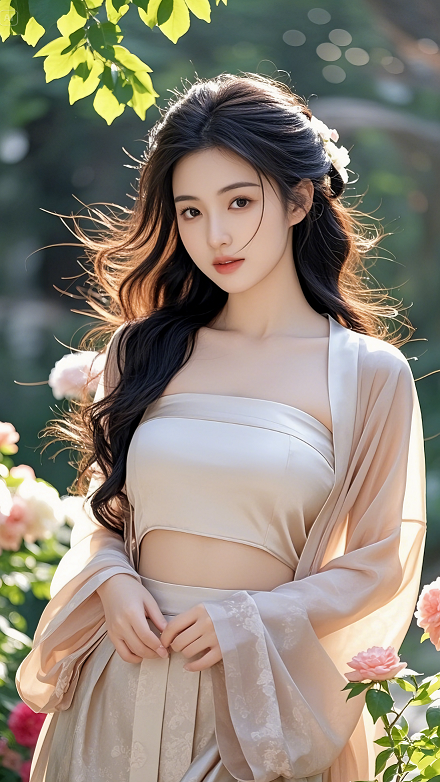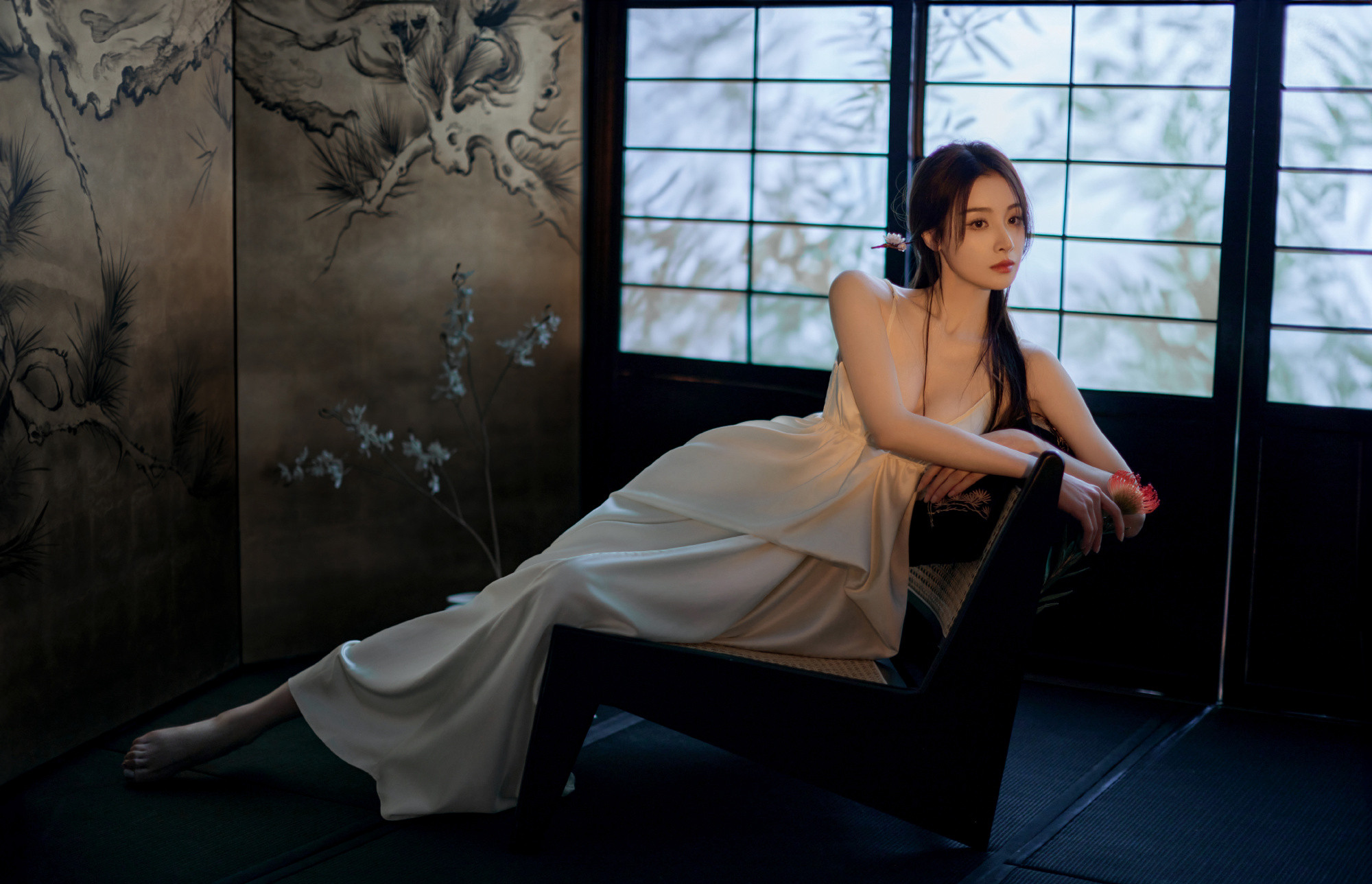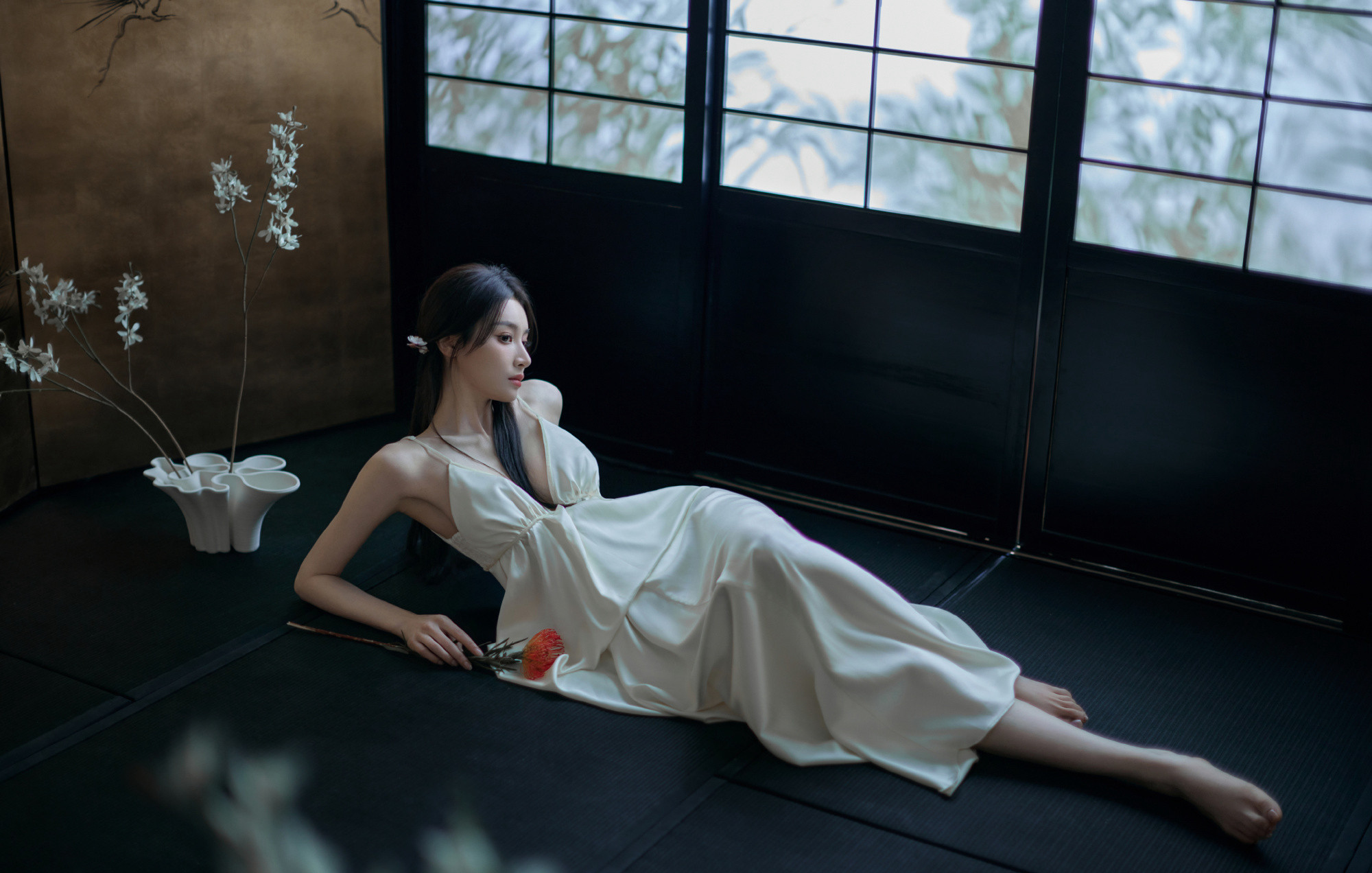 @ 美女演员隆妮性感吊带低胸白裙穿着与花争艳私房写真,这身材真的好好哦!